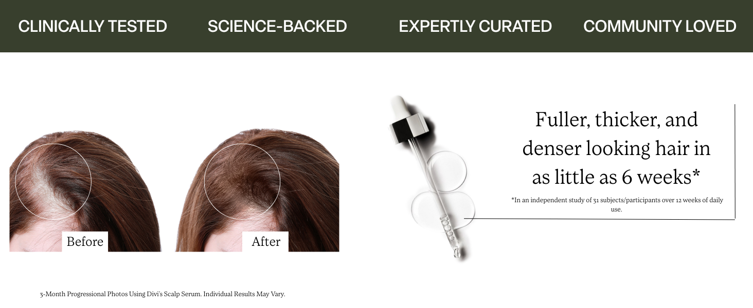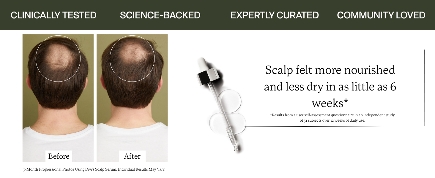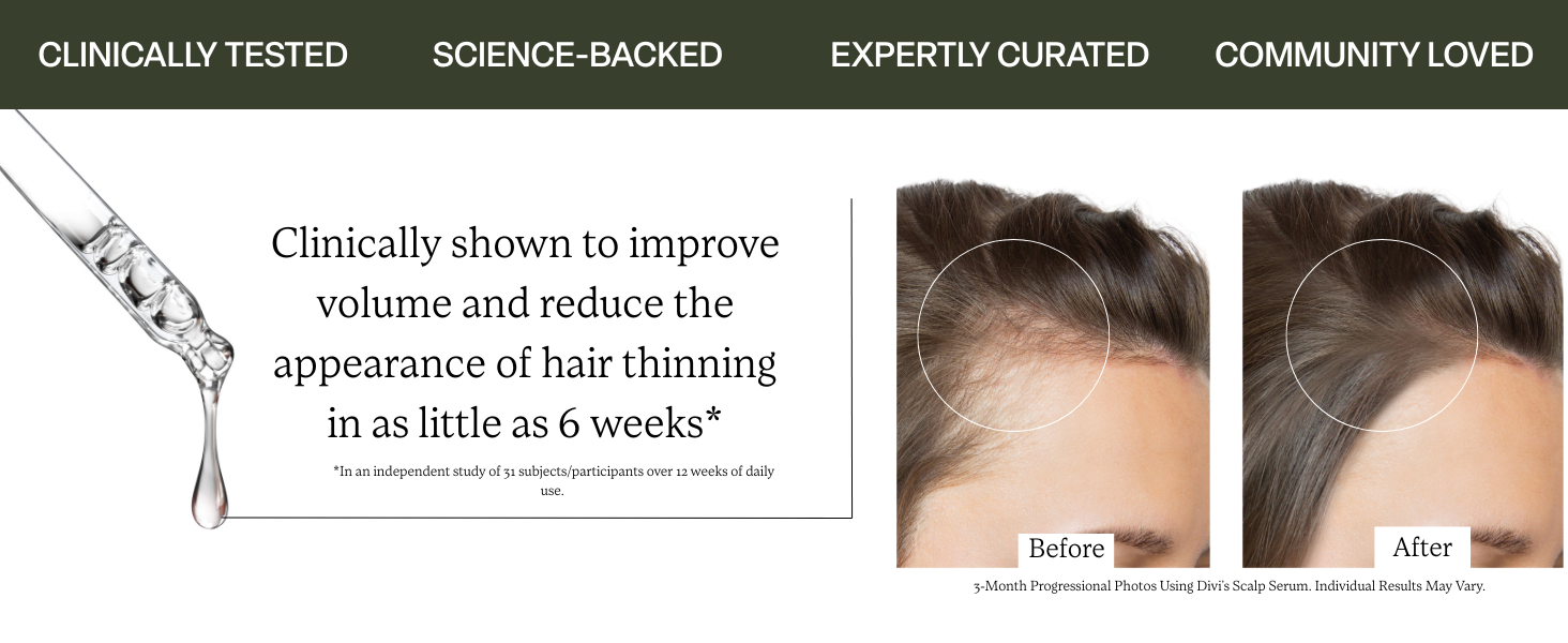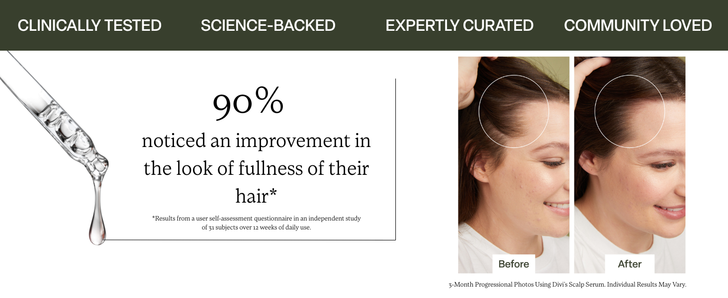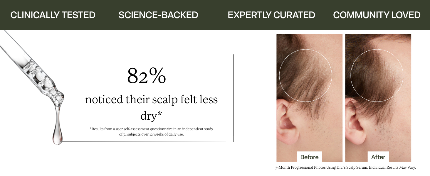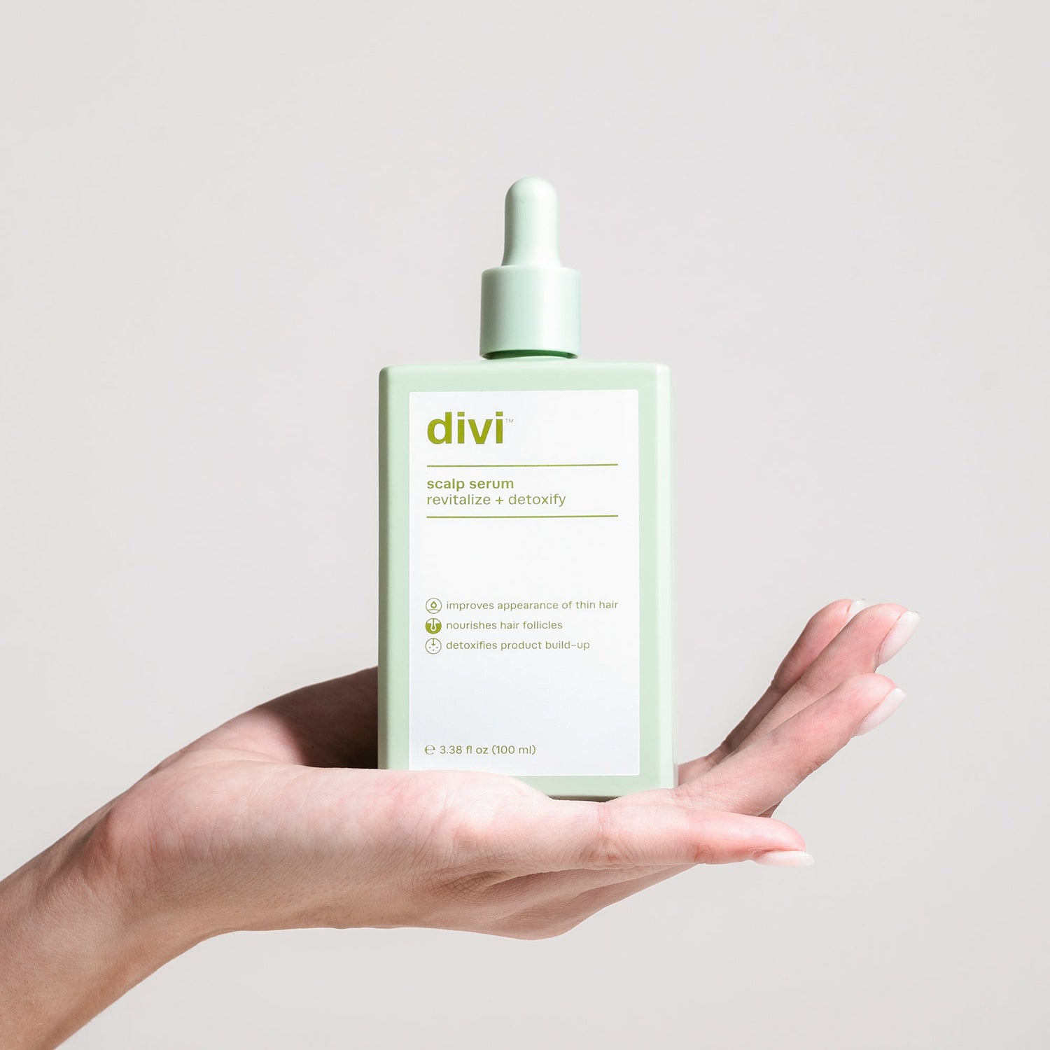 Our team at Divi is committed to creating hair and scalp care products incorporating clean, vegan, science-backed ingredients to fight hair loss. The dermatologist-approved Divi’s Scalp Serum features a proprietary blend of amino acids, peptides, vitamins and luscious-but-clinically effective botanical extracts to combat hair loss and stimulate hair regrowth. Our team of scientific researchers has developed a formula based on the science and clinical studies behind each ingredient as it relates to scalp health and hair development.